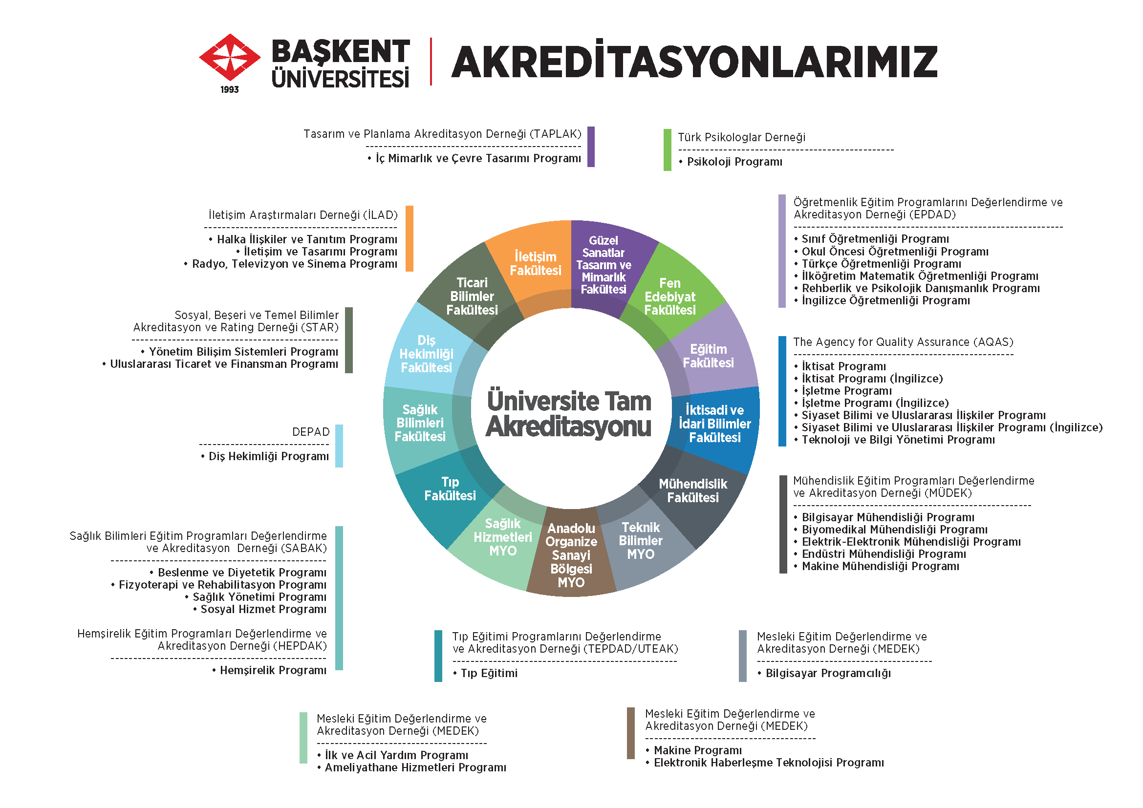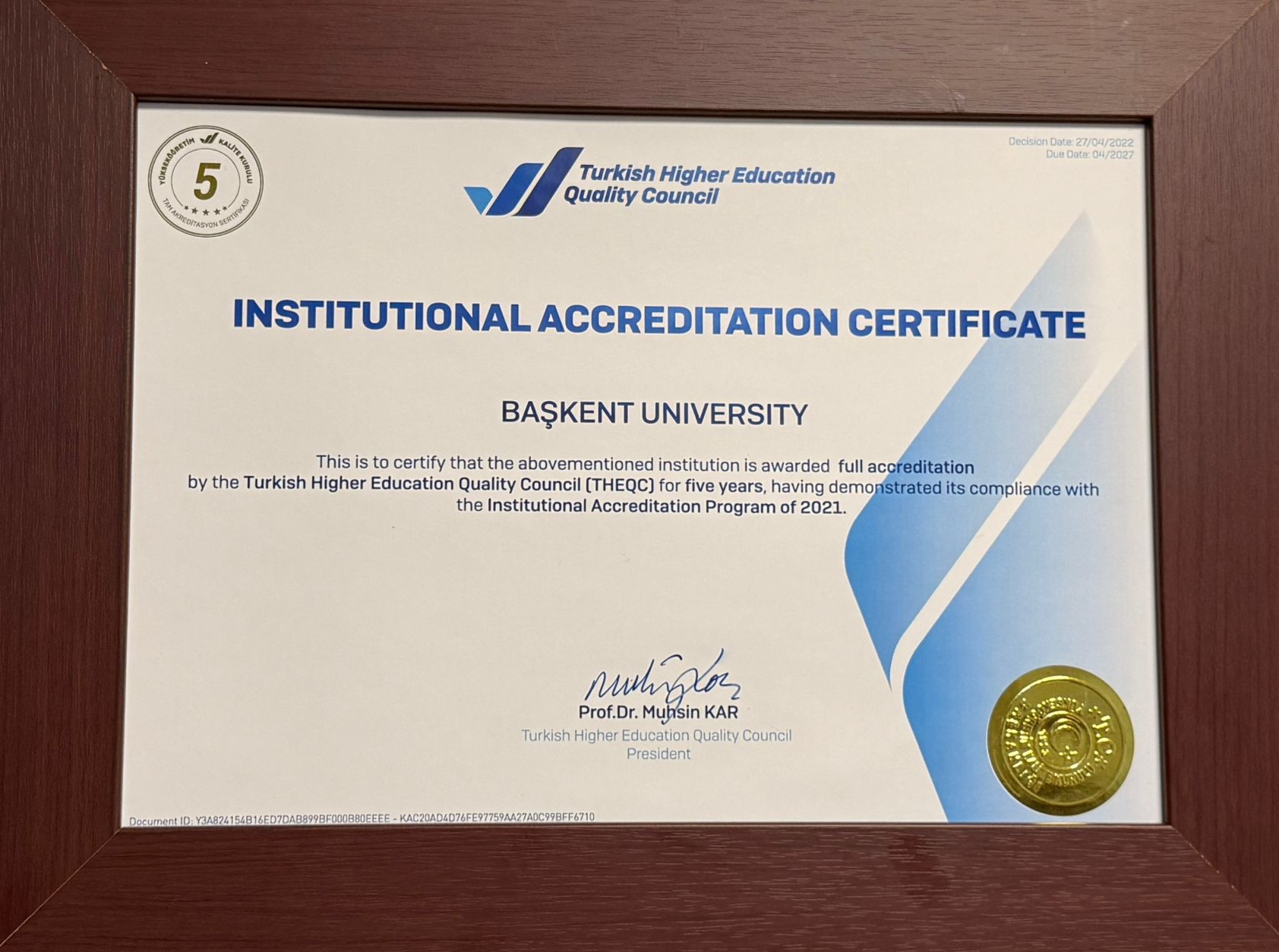 Kalite güvencesi alanındaki güçlü kurumsal yapısının bir göstergesi olarak, Başkent Üniversitesi, Yüksek Öğretim Kalite Kurulu (YÖKAK) tarafından yapılan değerlendirme sonucunda 27 Nisan 2022 tarihinde 5 yıllık tam kurumsal akreditasyon almaya hak kazanmıştır. Ayrıca, üniversitemiz bünyesindeki fakülte programlarına ait 37 akreditasyon bulunmaktadır.
